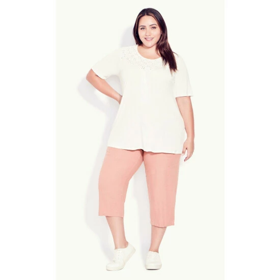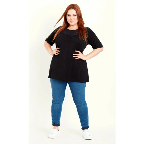 Look cute around the clock in the Broderie Trim Top. Designed to keep you comfortable, indulge your curves in the soft fabrication while the broderie trim adds a chic touch to any outfit. Key Features Include: Round neckline, Broderie trim detailing, Short sleeves, Hip length hemline, Soft stretch fabrication Shake up your look with relaxed jeans and canvas trainers.