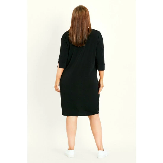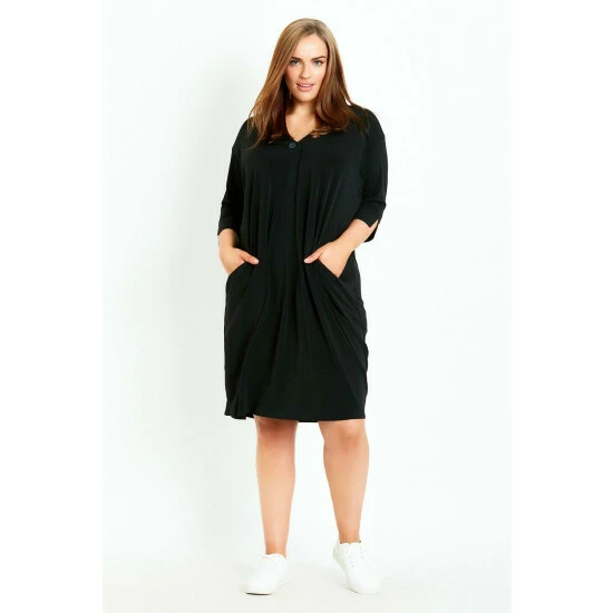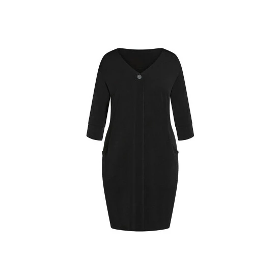 Step up your style in the Button Sleeve Dress. Perfect for work or weekends, keep it chic with this gorgeously draped design. Key Features Include: V-neckline with button detail, Front pleat, Elbow length sleeves with split cuff, Relaxed fit, Functional front pockets, Knee length hemline, Stretch fabrication.