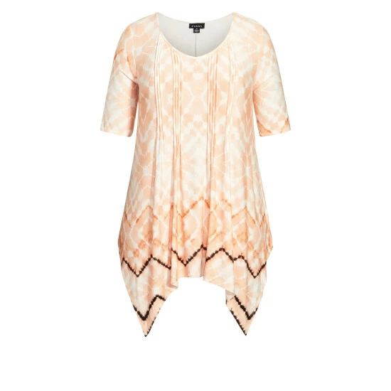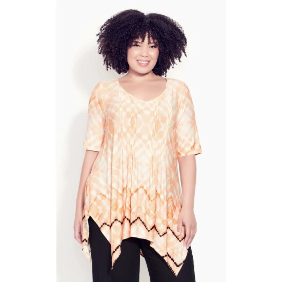 Stand out from the crowd with the Cyrus Pintuck Border Top! This unique style features a pintuck design and handkerchief hemline, giving you a textured look that brings some flair to your everyday look. Finished with a soft stretch fabrication for a comfortable finish, you’ll be loving this apricot-coloured piece for years to come. Key Features Include Soft V-neckline , Pintuck detail to front , Elbow-length sleeves , Soft stretch fabrication , Relaxed silhouette , Handkerchief hemline.