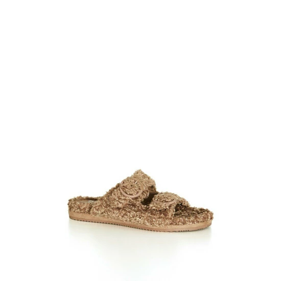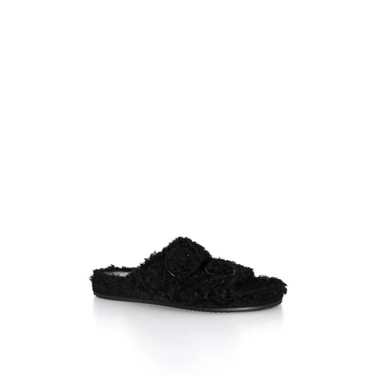Super soft and oh-so trendy, the Fluffy Slide brings a playful touch to any casual outfit! Complete with a super soft faux fur fabrication and easy slip on style, no Sunday afternoon is complete without this practical pair! Key Features Include: Round toe, Double strap upper, Buckle detail, Slip on style, Soft faux fur fabrication, Thick sole Team with a slogan tee and cropped jeans for go-to weekend styling.