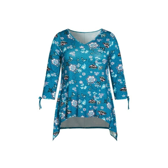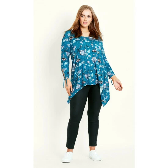 Complement your curves in the Hanky Hem Jersey Top. Crafted in a soft stretch fabrication, you’ll love the flared hemline and tie sleeves. Key Features Include: V-neckline, 3/4 sleeves with tie, Flared hemline, Soft stretch fabrication, Relaxed fit Team with mid wash jeans and a longline cardigan.