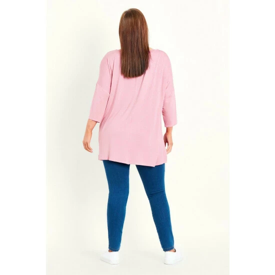 Embrace effortless styling with the Oversized Tee in pink. Add this eye-catching hue to your wardrobe, with the flattering fit and 3/4 sleeves. Key Features Include: Round neckline, Drop shoulder 3/4 length sleeves, Relaxed oversize fit, Soft stretch fabrication, Below hip hemline Elevate your look with checked trousers and gold jewellery.