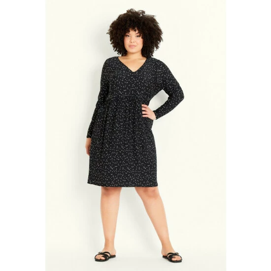 This on-trend dress is a simple yet effective addition to any wardrobe! This floaty dress instantly styles itself and creates an elegant silhouette, whilst a sleek black hue keeps this piece versatile and easy to wear. Features a polka dot print, V-neckline, long sleeves, relaxed fit, knee length. Team with black tights and ankle boots for sleek everyday style.