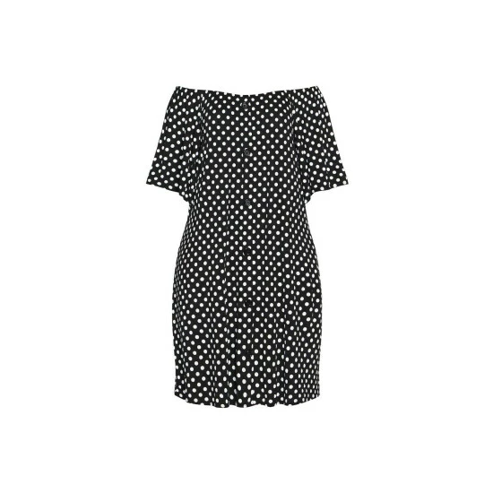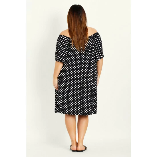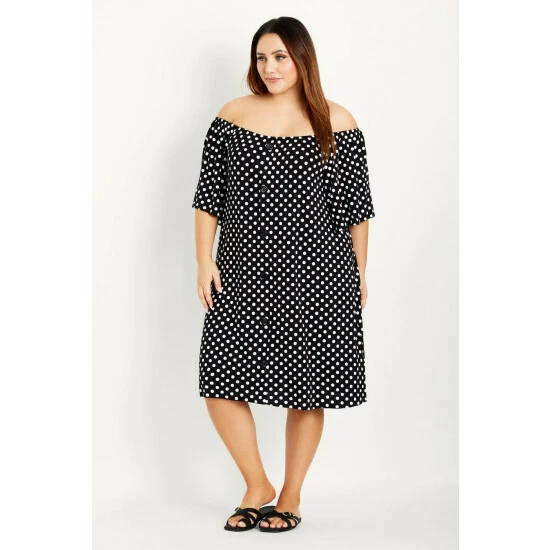 A perfectly curve-loving choice for warmer days, the Spot Bardot Dress features a seductive off-shoulder neckline and comfortable relaxed fit to keep things breezy. Made of a lightweight fabrication, this dress is bound to elevate your everyday styling wardrobe! Key Features Include: Elasticated off-shoulder neckline, Elbow-length sleeves, Relaxed fit, Non-functional buttoned front, Lightweight stretch fabrication, Pull over style, Unlined, Midi length For en effortlessly chic touch, team with a cinching waist belt, woven slides and sleek cat-eye sunglasses.