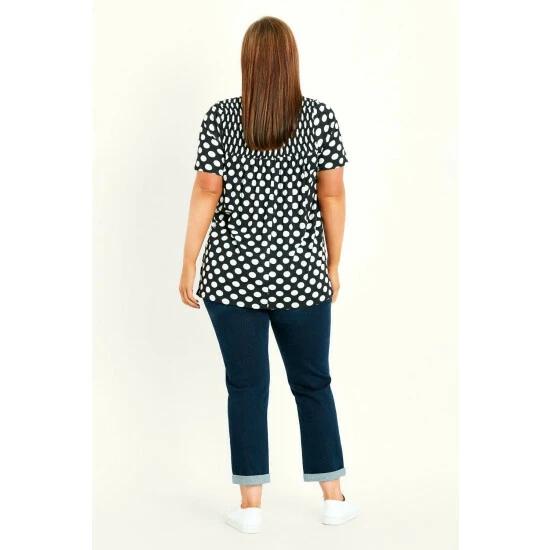 Keep it casual with the Spot Shirred Yoke Top. With a relaxed fit and short sleeves, this polka dot top is the perfect off-duty go-to. Key Features Include: Round neckline, Short sleeves, Shirred yoke, Relaxed fit, Hip length hemline.