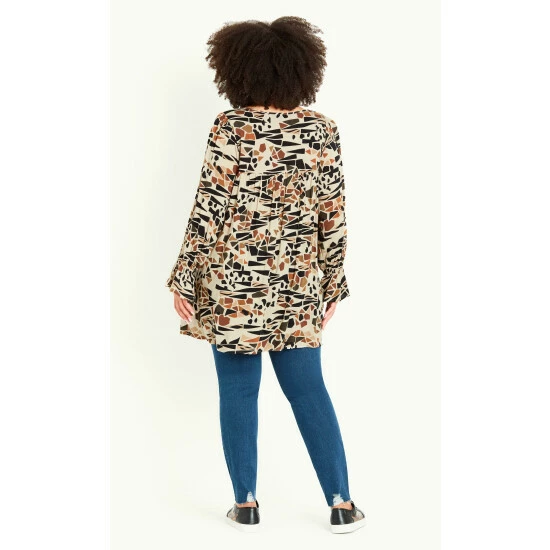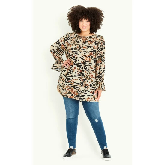 Geometric glamour in a relaxed silhouette, feel dreamy in the Symbolize Pintuck Tunic. The neutral colours add to any outfit, kept chic with ruffle cuffs and lattice trim detailing. Key Features Include Round neckline with keyhole detail, Long sleeves with ruffle cuff, Embroidered lattice trim, Pintuck yoke detail, Relaxed fit, Below hip hemline.