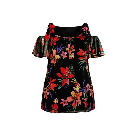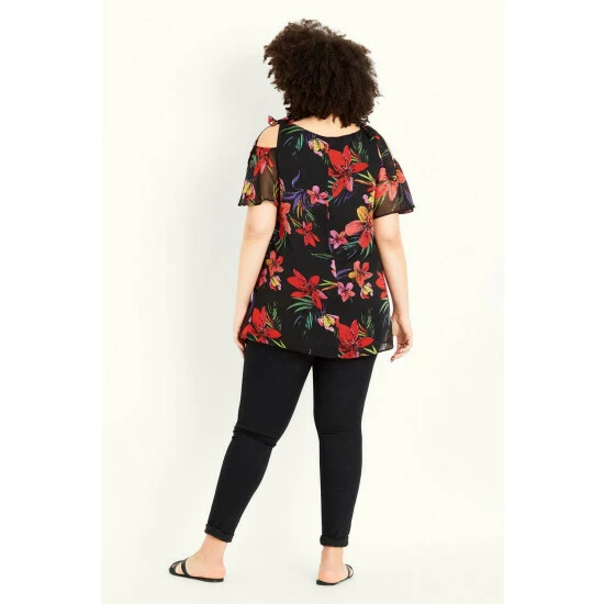 Dial up your summer rotation with the fun-loving tropical print of our Tropical Cold Shoulder Top! A breezy design for warmer days, this top features a relaxed fit, elasticated sleeves and trending cold shoulder detail. Key Features Include: Round neckline, Cold shoulder detail with ties, Elasticated short sleeves, Fully lined, Relaxed fit, Pull over style, Hip length Tuck this top into a pair of svelte black jeans, finishing with block heels and drop earrings for an elevated evening look.